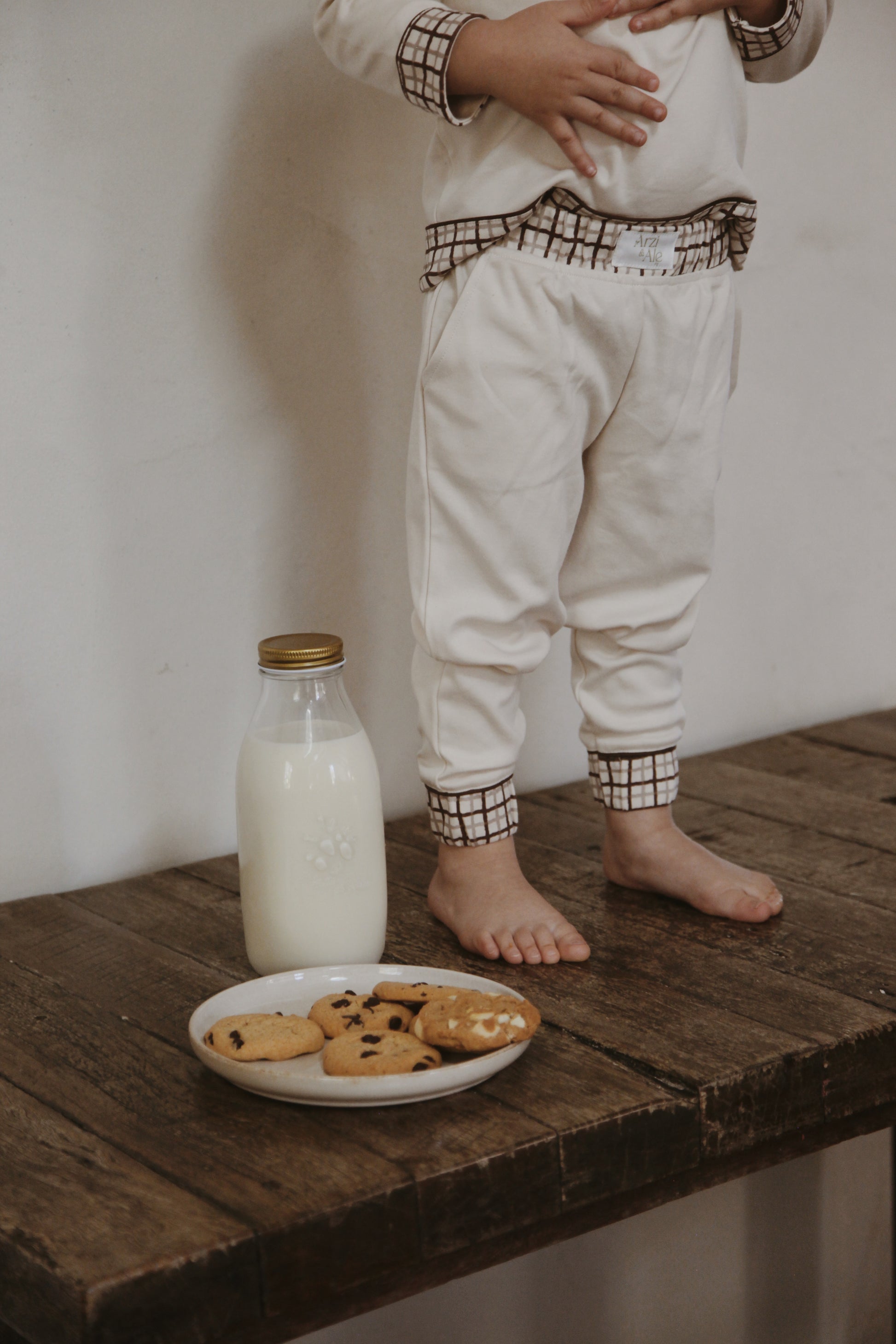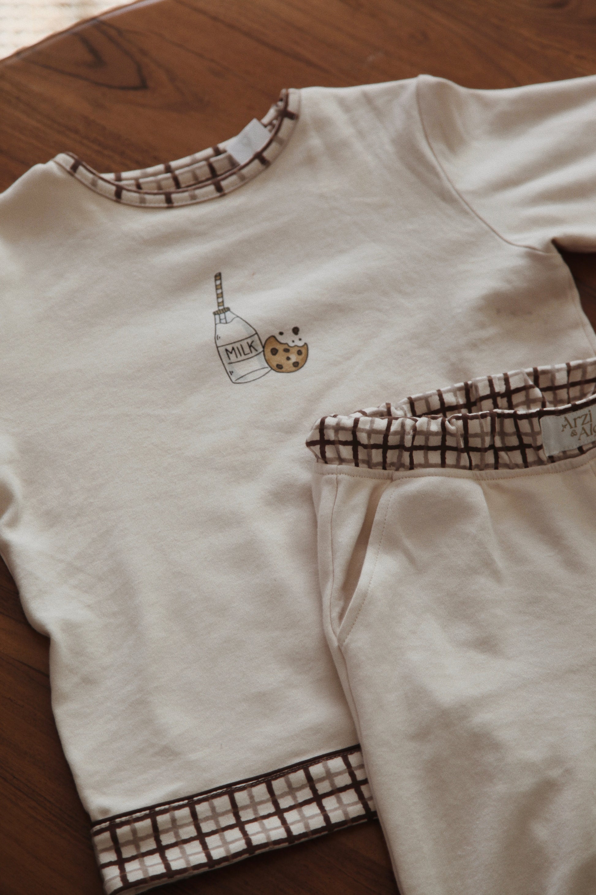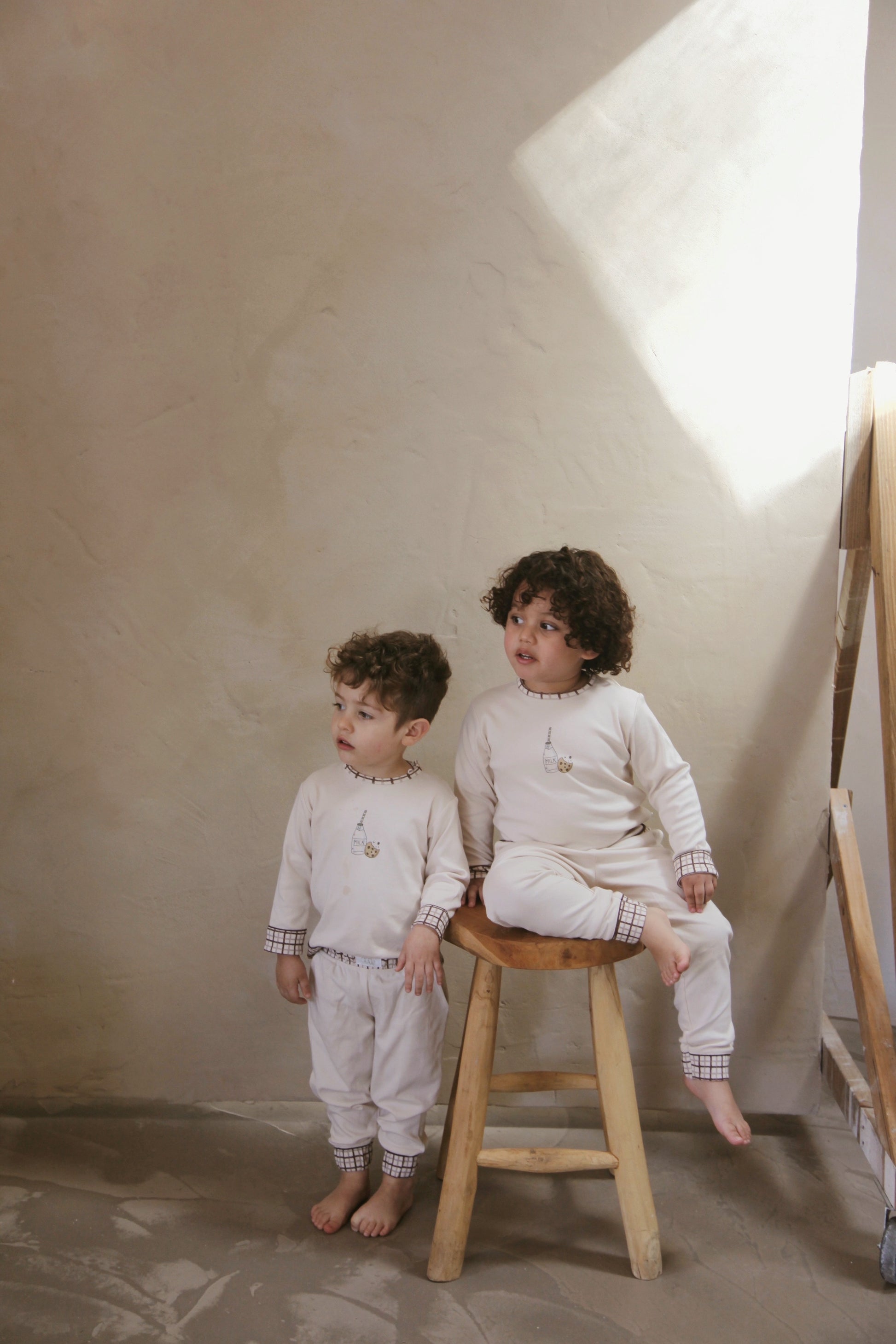 For a looser, more relaxed fit, we recommend sizing up. This organic cotton kids' set offers the perfect combination of style, comfort, and practicality, making it ideal for both sleep and play.
