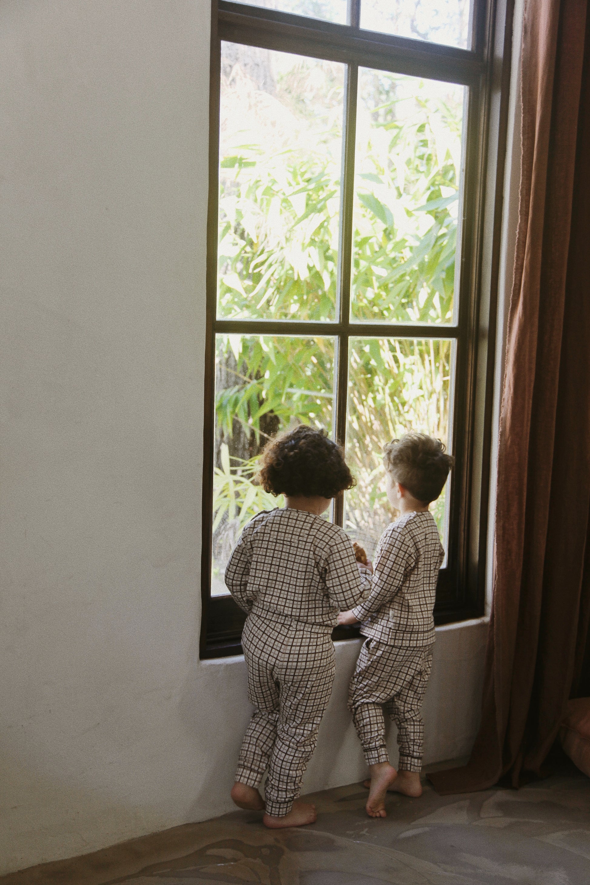 For a looser, more relaxed fit, we recommend sizing up. This organic cotton kids' set offers the perfect combination of style, comfort, and practicality, making it ideal for both sleep and play.